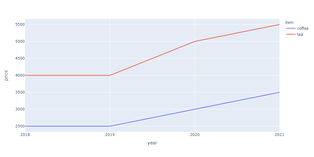 fig = px.line(df, x='year', y='price', color='item', height = 500 , width = 1000)