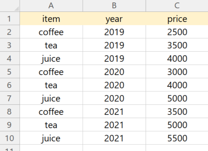 df = df.melt(id_vars = ['item'], value_vars=year, var_name = ['year'], value_name='price')