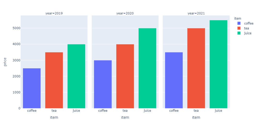 그 안에 데이터프레임(df), x축에 해당하는 칼럼인 'item', y축에 해당하는 칼럼인 'price'를 인자로 넣었고, 색 지정을 'item' 데이터에 따르도록 설정하였습니다. 위 그래프에서 'item' 칼럼에 따라 동일한 데이터는 색상이 같음을 확인할 수 있습니다. 또한 이러한 그래프를 'year' 칼럼에 따라 만들어지도록 하였습니다.