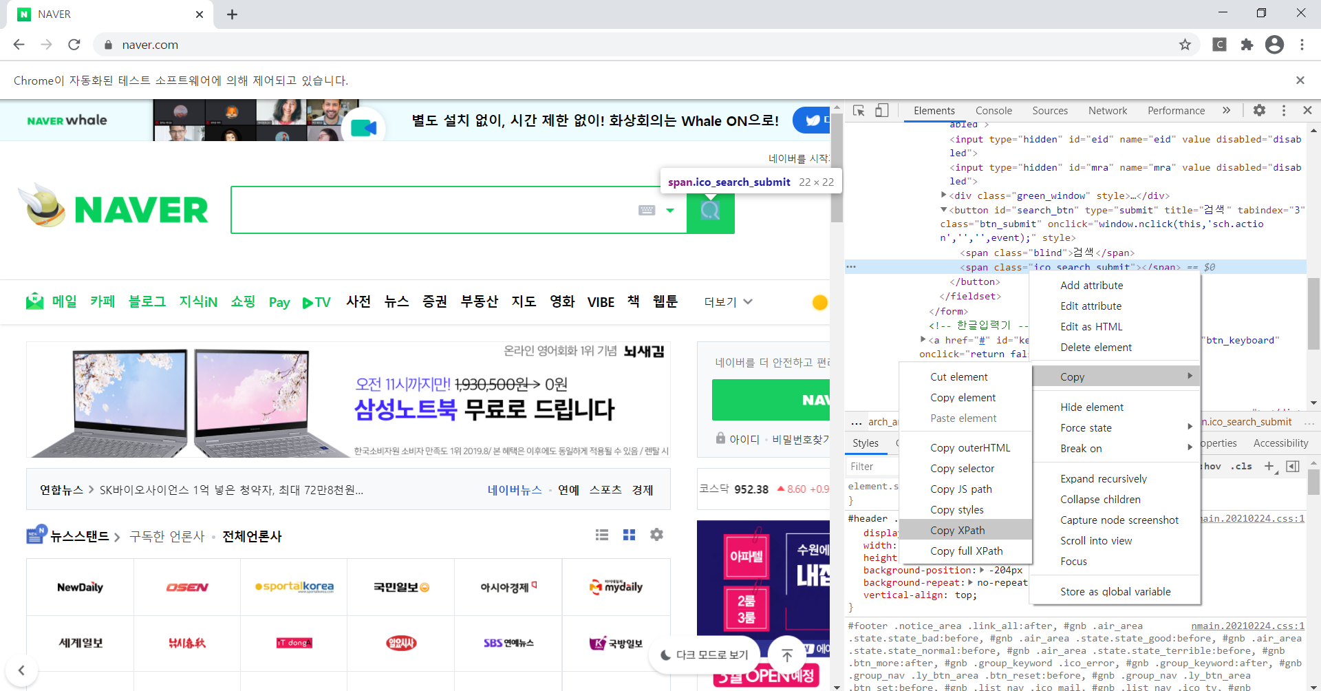 xpath를 붙여놓기 하면 //*[@id="search_btn"]/span[2]와 같은 코드가 출력되는 것을 확인할 수 있습니다.