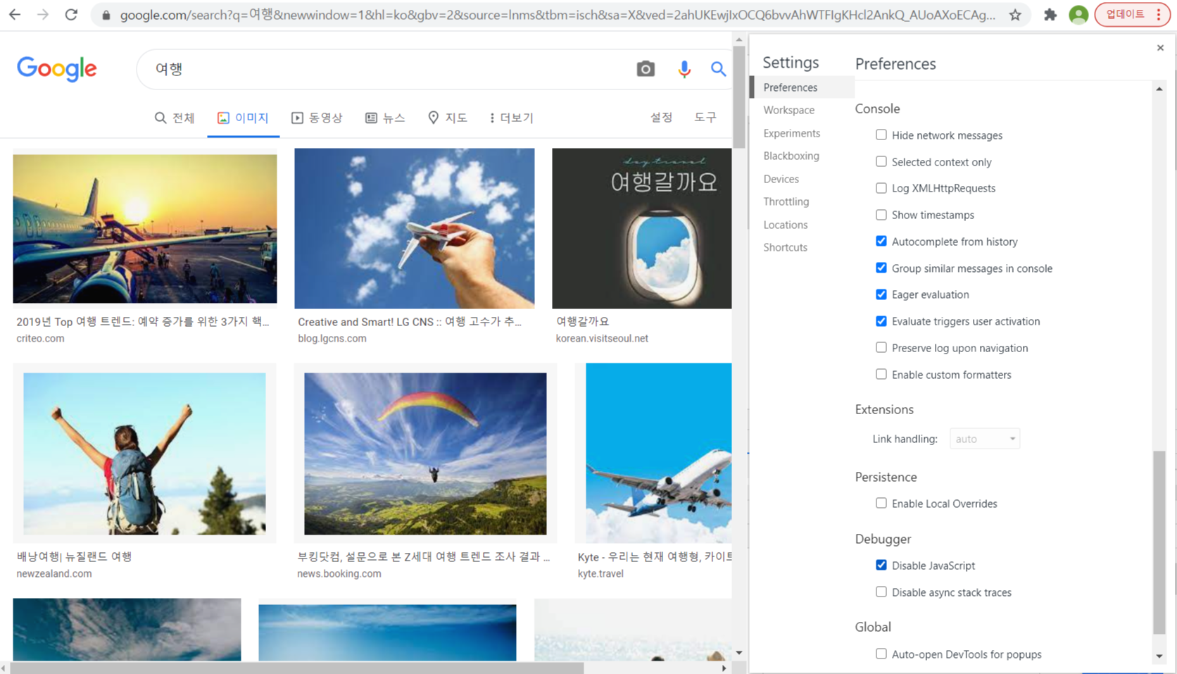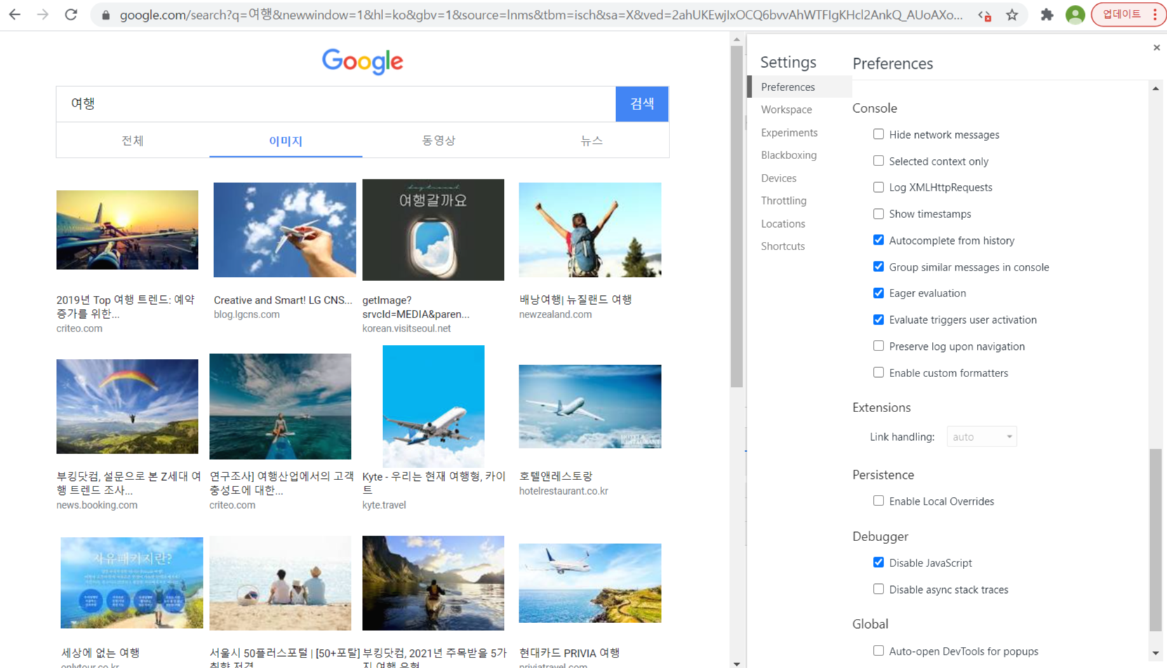 저는 위 이미지처럼 구글에 '여행' 이라는 키워드를 입력한 후 이미지 페이지에서 자바스크립트를 해제했더니 아래와 같이 이미지가 보이는 페이지 형식이 조금 달라졌습니다.