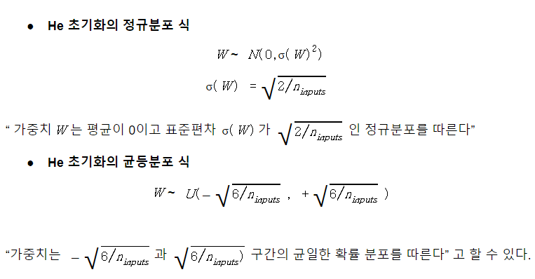 Xavier와 유사하지만 He는 입력 노드와 출력 노드의 개수를 모두 고려하지 않고 입력 노드 수만 고려한다는 점에서 차이가 있다.