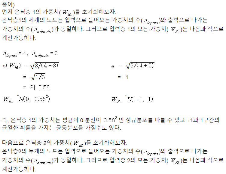 아래 그림과 같은 3층 신경망이 있다.  Xavier 를 이용해 은닉층 1, 2의 가중치 값을 초기화 를 계산 해 보아라.