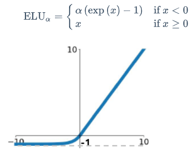 ELU는 2015년 Clevert et al 논문에 제안된 활성화 함수로 입력이 음수일때 exp를 활용한 함수이다. ELU는 ReLU의 장점을 모두 가지며 0보다 작은 입력에 대해 미분 값이 0이 아니므로 dying ReLU 문제가 발생하지 않는다. 하지만 exp() 계산이 필요해 연산 비용이 든다는 문제가 있다.