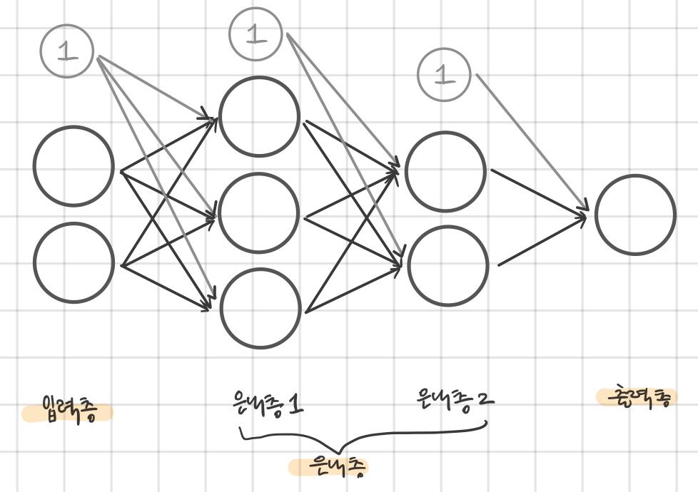 먼저 그림에서 동그라미는 노드라고 부르며(뉴런 혹은 feature라고도 한다) 화살표는 가중치이다. 화살표 방향을 보아하니 순방향으로 흘러가고 있음을 알 수 있다. 이전에 신경망의 층수를 정할 때 가중치의 영향을 받는 층의 개수만을 고려한 것을 기억하는가? 위 신경망에서 가중치에 영향을 받는 층은 은닉층1, 은닉층2, 출력층으로 그림은 3층 신경망의 그림이다(Quiz 1)