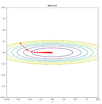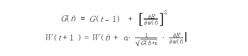 변수 G 는 상태가 변할 때마다 기울기의 제곱 값이 계속 더해지게 된다. 즉 과거의 기울기를 가진 값으로 시간이 지날수록 점차 커지는 것이다. 변수를 갱신할 때 학습율을 G(t) 값으로 나누어 이동거리를 조정하는데 시간 t가 커질수록 과거의 기울기를 계속 더한 G(t) 값이 점차 커지게 되므로 학습률 α를 낮추게 만든다. 참고로 상태 t 가 변할 때 마다 그때의 가중치 w(t)의 영향을 보는 것이기 때문에 변수별로 학습률이 다르게 결정되어 ‘맞춤형 학습률’을 주게 된다. 수식에 사용된 ε 기호는 아주 작은 상수를 뜻하며, 0으로 나뉘는 문제를 방지하기 위해 대게 1e-6 정도의 값을 더해준다.