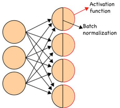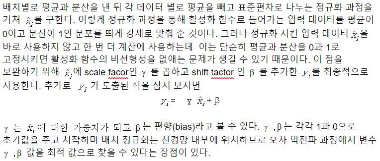 배치 정규화는 말 그대로 한 번에 들어오는 입력 단위인 배치 마다 정규화를 진행하는 기법이다. 이로써 활성화 함수의 입력 데이터를 정규분포로 맞추어 내부 공변량 변화를 해결한 것이다. 아래의 그림처럼 배치정규화는 활성화 함수를 통과하기 전에 배치 정규화 과정을 추가한다.