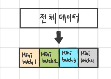 1부터 4까지의 비니배치에 대하여 미니배치 학습을 시키면 전체 데이터 한번을 학습시키게 되는 것이다.