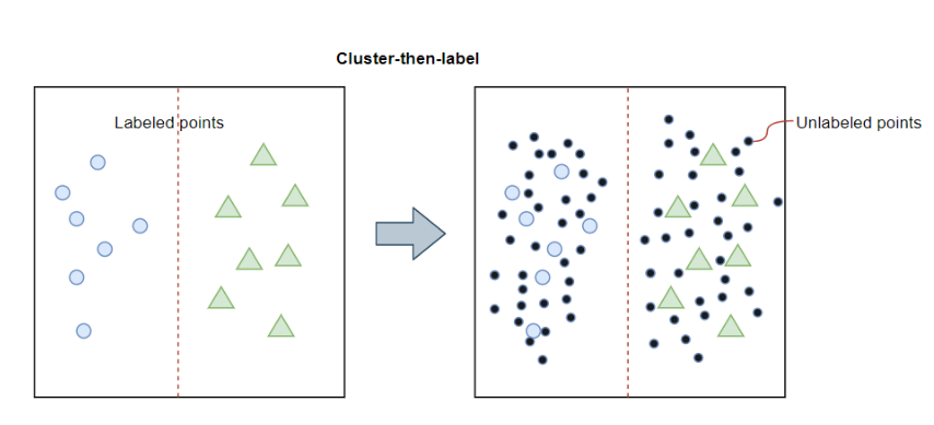 데이터의 형태에 맞게 학습 방식 또한 지도 학습과 비지도 학습의 조합으로 이루어져 있는데, 라벨이 없는 데이터를 그룹화 할 때 라벨이 존재하는 일부 데이터를 이용하는 방식이다.