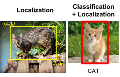 위치 인식이란 이미지 안의 물체가 이미지의 어느 영역에 있는지 위치 정보를 출력해 주는 것이다. 주로 물체를 사각형으로 표시를 하는데 사각형의 왼쪽 위(left top)와 오른쪽 아래(right bottom) 좌표를 출력한다. 이때 사각형을 Bounding box라고 하며 물체의 위치 정보를 알려주는 작업이 바로 물체 위치 인식이다.
