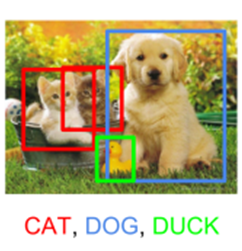물체 검출이란 물체가 무엇인지 분류(classification)하는 과정과 물체가 어디에 있는지 위치정보를 알려주는(Localization) 과정이 동시에 수행되는 것을 의미한다. 하나의 객체만 찾는 위치인식(localization)과는 다르게 검출(detection)은 다양한 물체를 찾을 수 있다는 차이점이 있다. 분류하려는 종류에 따라 이진 분류와 다중 분류가 있는 것처럼 특정 물체만 검출하는 경우와 여러 개의 물체를 검출하고자 하는 경우가 있는데 다음의 그림은 후자인 Multi object detection의 예시이다.