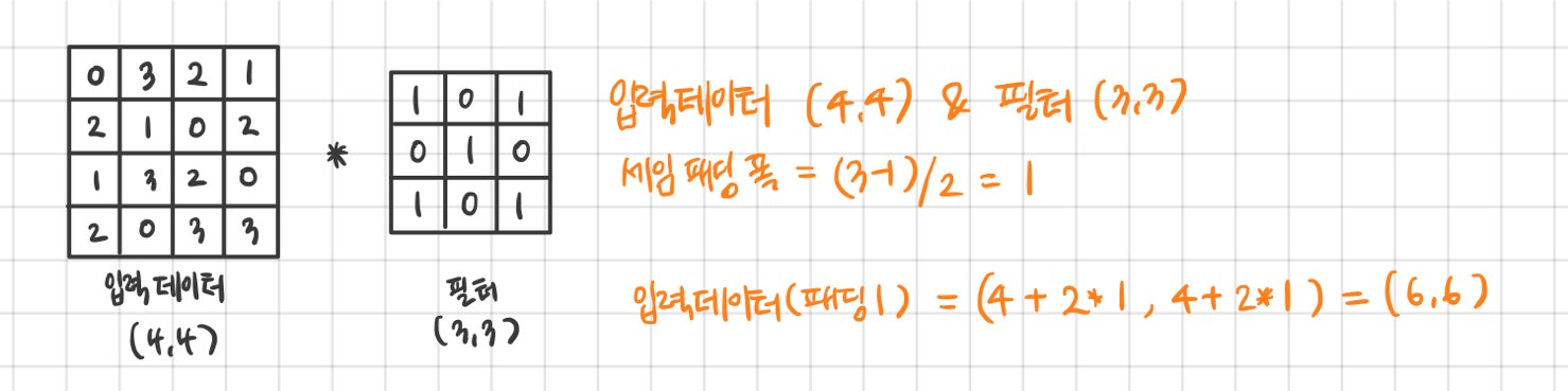 다음으로 소개할 패딩은 세임 패딩(same padding)이다. 세임 패딩은 출력 크기를 입력 크기와 동일하게 유지한다. 입력데이터 (Hi,Wi) 와 (F, F) 사이즈의 필터가 있을때 세임 패딩의 폭 P는 (F-1)/2가 된다. 그러므로 세임 패딩을 적용한 입력 데이터의 크기는 (Hi+2*P, Wi+2*P)가 된다. 이처럼 세임 패딩은 풀패딩의 절반 개념이므로 절반 패딩(half padding) 라고도 부른다. 마찬가지로 위의 예시를 이용해 값을 계산해보면 아래와 같다.