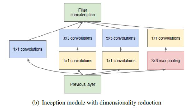 단, 크기에 따라 세종류의 필터가 생긴 만큼 합성곱의 계산 또한 사이즈 별로 여러번 진행 되어 비용이 증가하는 문제가 생긴다. 그래서 최종적으로 그림 (b)처럼 (1,1)사이즈의 필터를 추가 한 구조가 인셉션 모듈을 사용하는데 (1,1) 사이즈의 필터를 통해 피처맵의 깊이(장수)를 줄일 수 있기 때문이다. 가령 (100,100,80)의 이미지에 (1,1) 필터 40개를 사용한다면 피처맵은 (100,100,40) 사이즈가 된다. 이는 입력 이미지의 채널이 80개에서 20개로 ‘차원 축소’ 되었다고 볼 수 있다. 그 결과 합성곱 연산량이 감소되는 이점을 가져온다.