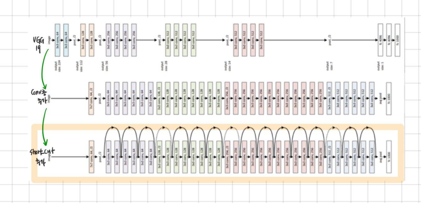 ResNet는 기본적으로 VGG19의 구조를 따른다. 여기에 convolution 층들을 추가해 깊이를 추가하고 shortcut을 추가하면 ResNet의 가장 간단한 구조(layer 34개인 plain network)가 된다.