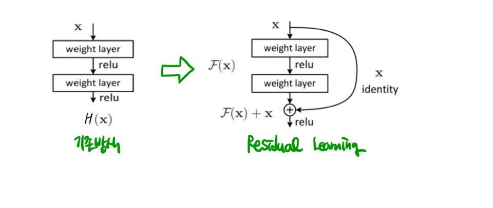 ResNet(Residual Network)은 마이크로소트프의 중국 연구진들이 개발하여 2015년 ILSVRC 대회에서 우승한 신경망이다. 놀라운 점은 대회에서 Top-5 오류율이 3.57%라는 것인데 보통 사람이 이미지를 인식할때 오류율이 약 5% 정도이므로 사람을 뛰어넘은 최초의 신경망으로 기록되었다. ResNet은 152개의 층 수를 가진 기존의 신경망과는 비교할 수 없을 만큼 깊은 신경망이다. 일반적으로 해결해야하는 문제가 복잡할 수록 신경망의 깊어 져야 하지만 기울기 손실(vanishing gradient) 혹은 기울기 폭발(exploding gradient)문제가 뒤따르고 깊어진 층 수 만큼 파라미터 수가 늘어나므로 에러가 커지는 상황이 발생한다. 다시 말해 기존의 구조로는 깊은게 무조건 좋은 건 아니라는 것이다. ResNet 연구진들은 신경망을 깊게 하기 위해서는 구조에 변화가 필요하다는 것을 깨달았다.