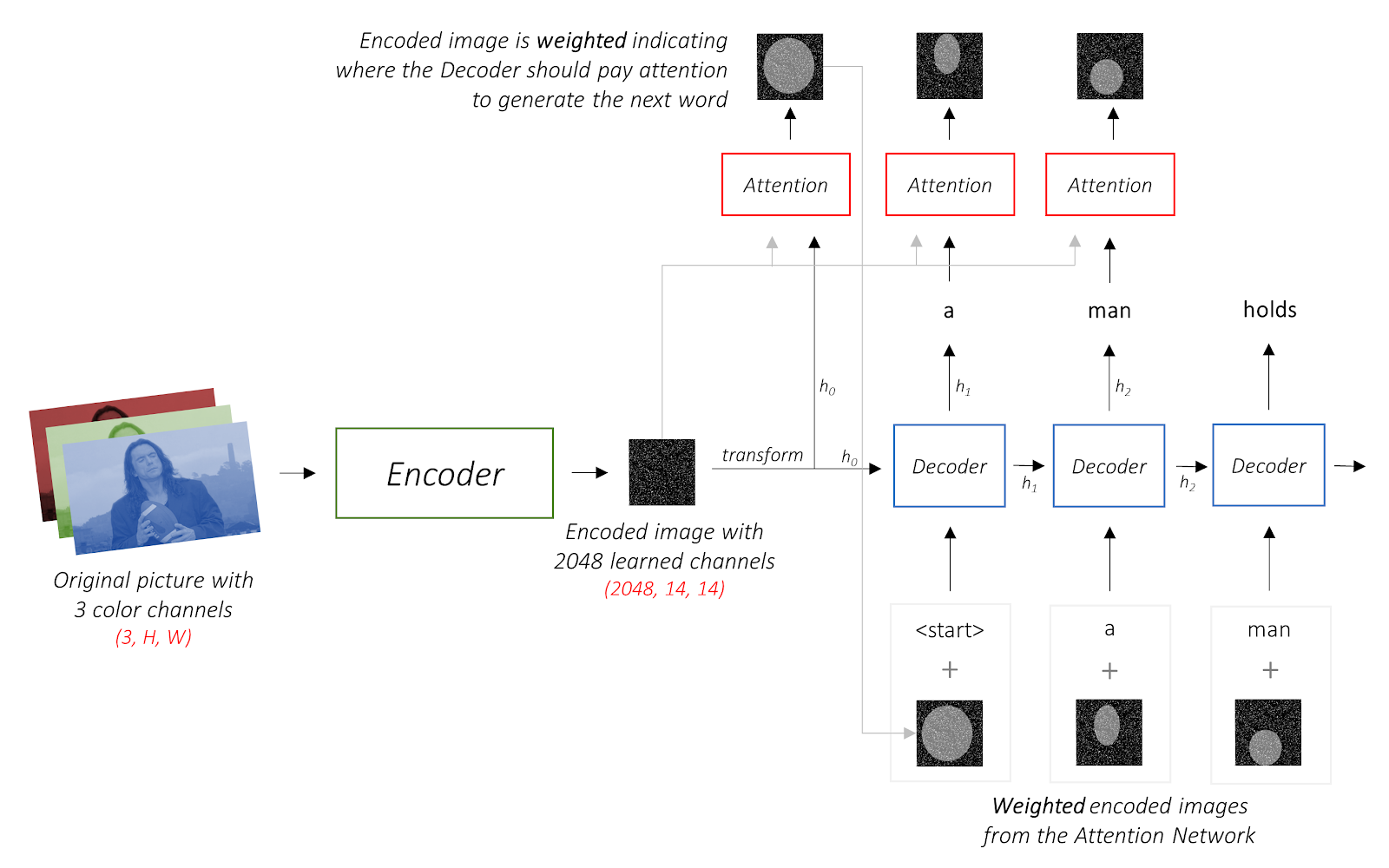 Attention은 문자 그대로 ‘집중’하려는 것이며 이를 이미지 캡셔닝에 적용하면 위 그림처럼 이미지의 특정 부분을 더 집중해서 보는 것이다. frisbee 단어를 생성할때 이미지에서 원반을 집중해서 보고 dog 단어를 생성할때 이미지 속의 개를 집중해서 본다. 즉, 모델이 디코딩 할때 관련된 인코딩 부분을 다른 픽셀보다 더 중요하게 고려하는 것이다.