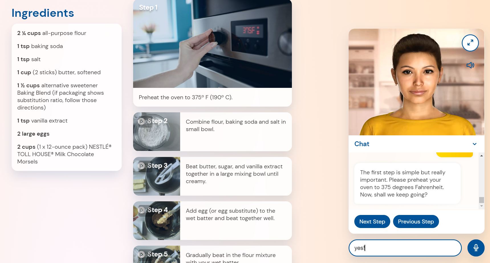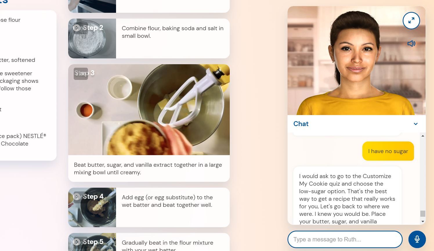바로 위 사진의 Cookie Coach인 Ruth가 바로 인공지능인데요, 요리법을 단계별로 알려주며, 원하는 쿠키를 만들 수 있도록 요리법을 변경해주고, 중간에 관련된 질문에 대해 대답을 해준다고 합니다!
