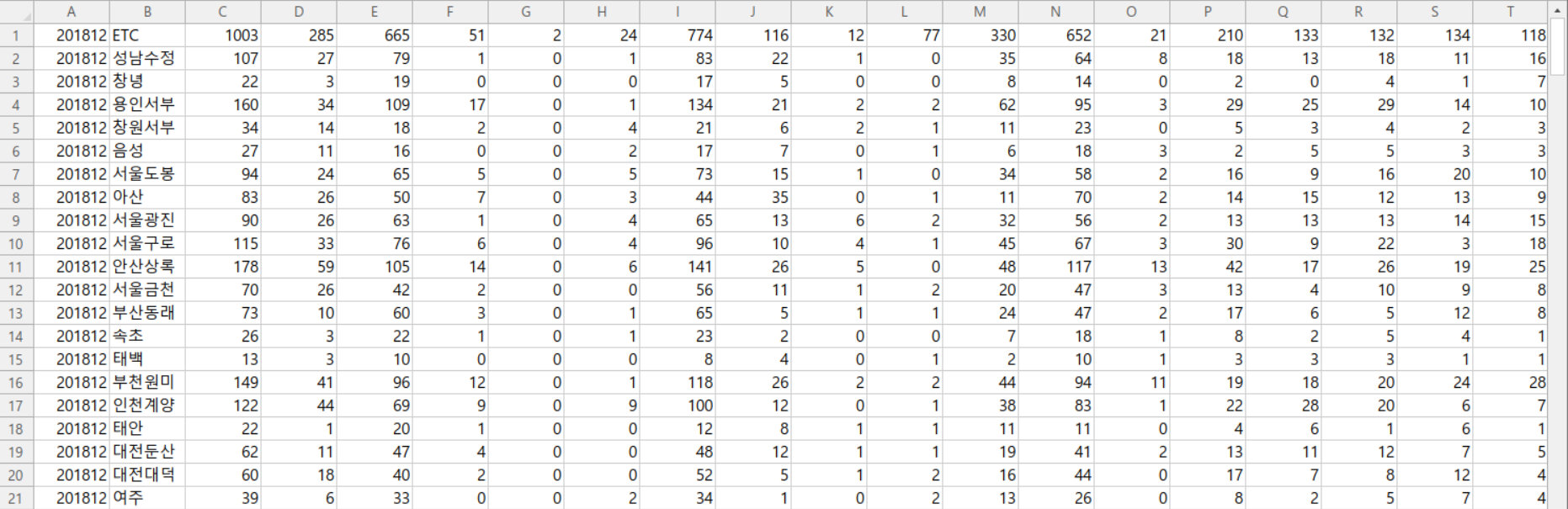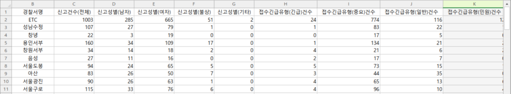 이제 데이터를 읽어보려고 하는데요, 스마트 치안 빅데이터 플랫폼에서 로그인한 뒤, 해당 데이터 파일을 다운로드 받으면 아래와 같이 데이터가 담긴 csv파일을 확인할 수 있습니다.