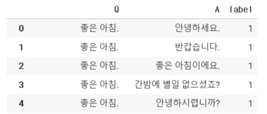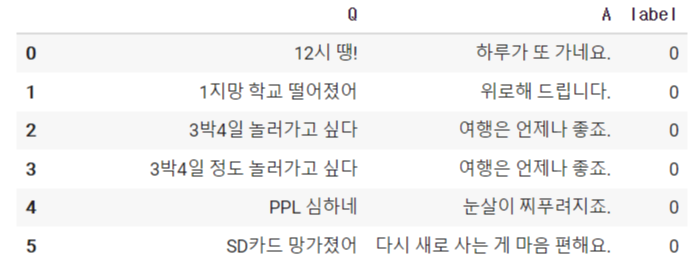 해당 데이터셋에서 일상 관련 데이터가 5290행까지라서 data[0:5290]으로 불러와줬다. 일상 대화 데이터는 아래와 같은 형식을 갖고 있다.