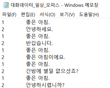 f = open(r'/content/drive/MyDrive/파이썬공부/챗봇/대화데이터_일상_오피스.txt',"r")