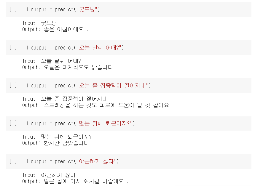 이제 predict() 함수에 문장을 입력하면 그거에 대한 결과가 출력된다. 아래 이미지는 새로운 문장을 넣었을 때 출력된 결과들이다.