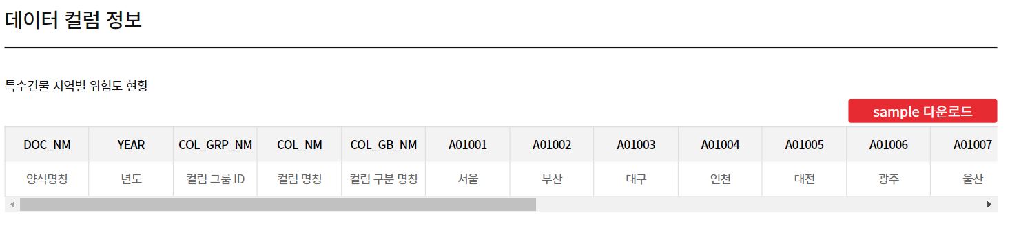 데이를 보면 [양식명칭]이라는 칼럼이 있는데 이는 위험도를 측정할 항목, [년도]는 측정 시기, [컬럼 명칭]은 세부적인 항목 기준을 나타내는 것 같습니다. 그리고 그 오른쪽으로는 지역별로 해당되는 특수건물의 수, 또는 그 측정값이 담겨 있습니다.