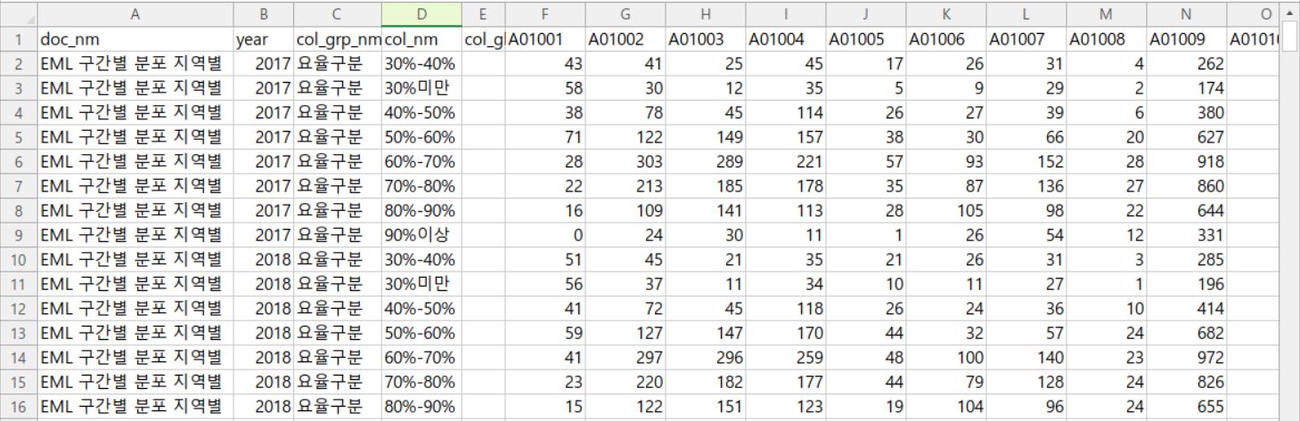 - 칼럼 : 양식명칭, 년도, 컬럼 그룹 ID, 컬럼 명칭, 컬럼 구분 명칭, 서울, 부산, 대구, 인천, 대전, 광주, 울산, 세종, 경기, 강원, 충북, 충남, 전북, 전남, 경북, 경남, 제주