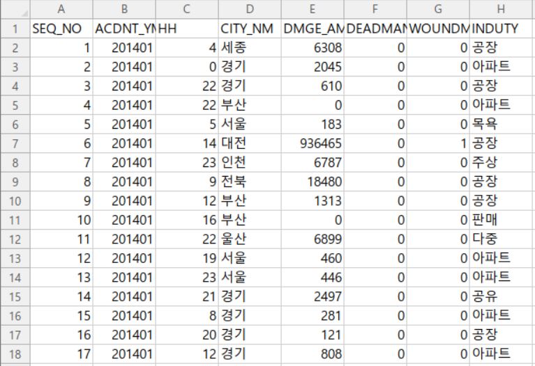 - 칼럼 : 일련번호, 사고년월, 시간, 도시명, 피해액(천원), 사망, 부상, 업종
