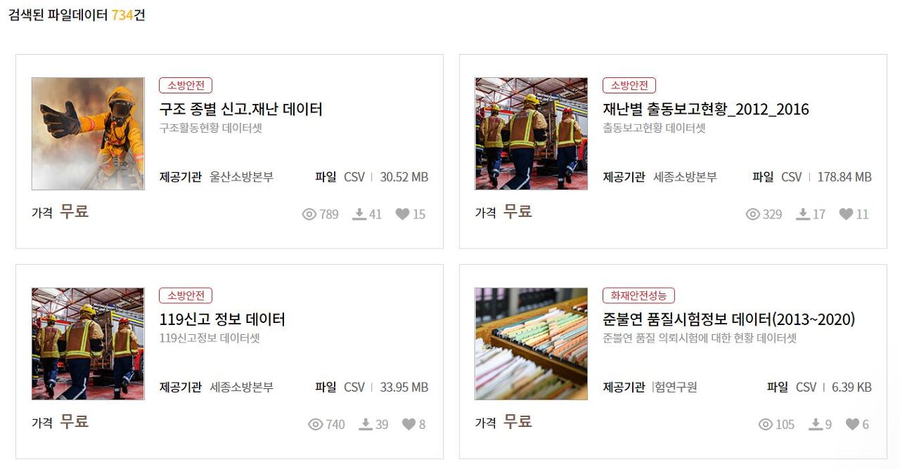 소방안전 빅데이터 플랫폼에는 소방안전정보부터 국민 생활안전정보, 재난예방 대응정보, 연구분석정보에 대한 데이터를 오픈하고 있는데요, 총 734건의 데이터를 다운로드 받아서 데이터분석에 사용할 수 있습니다.