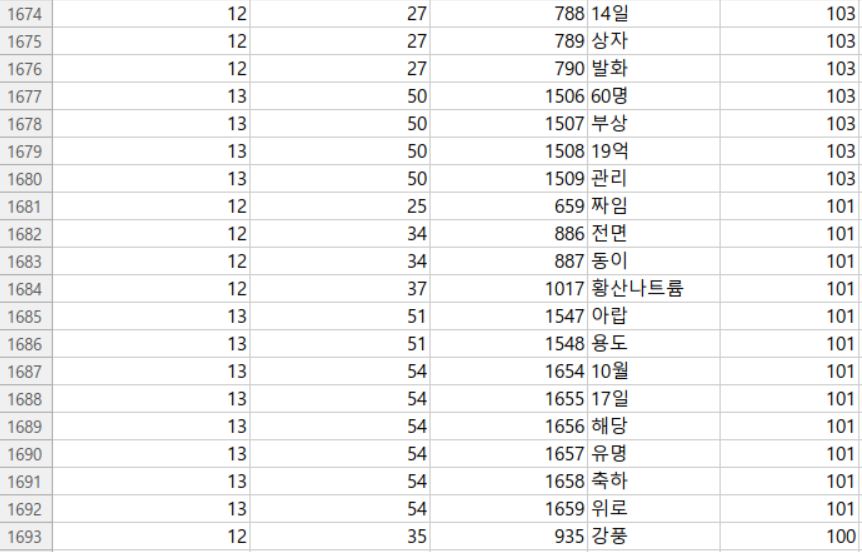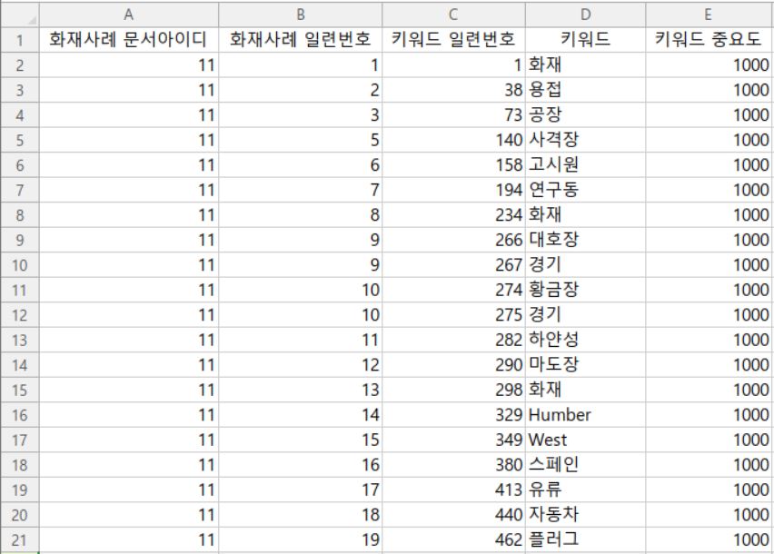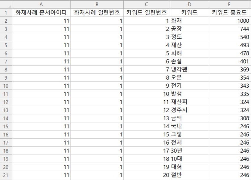 - 칼럼 : 화재사례 문서아이디, 화재사례일련번호, 키워드일련번호, 키워드, 키워드 중요도