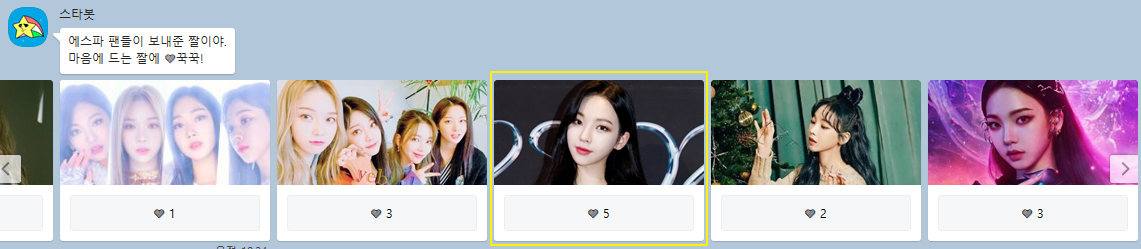 최애 짤을 누르면 에스파의 최신 짤들도 다양하게 확인할 수 있습니다. 마음에 드는 짤에 하트를 남길 수도 있는데요. 지금 가장 인기 있는 짤은 이 짤입니다. 저도 하트를 살포시 눌렀습니다.