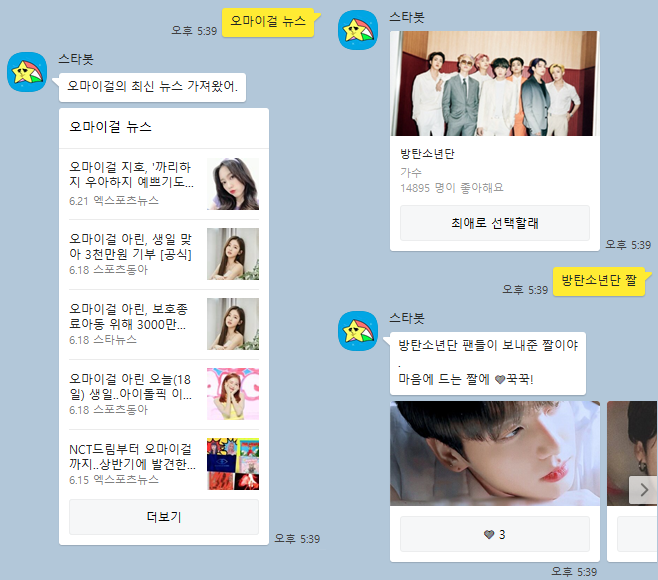 이렇게 방탄소년단을 채탕창에 직접 입력하거나, 채팅창 하단에 스타봇이 인공지능으로 추천해주는 검색어를 선택하면 원하는 정보를 바로 확인할 수 있다. '오마이걸 뉴스', '방탄 짤'을 입력하자 바로 결과가 짠!!(정말 똑똑합니다!+ㅡ+)