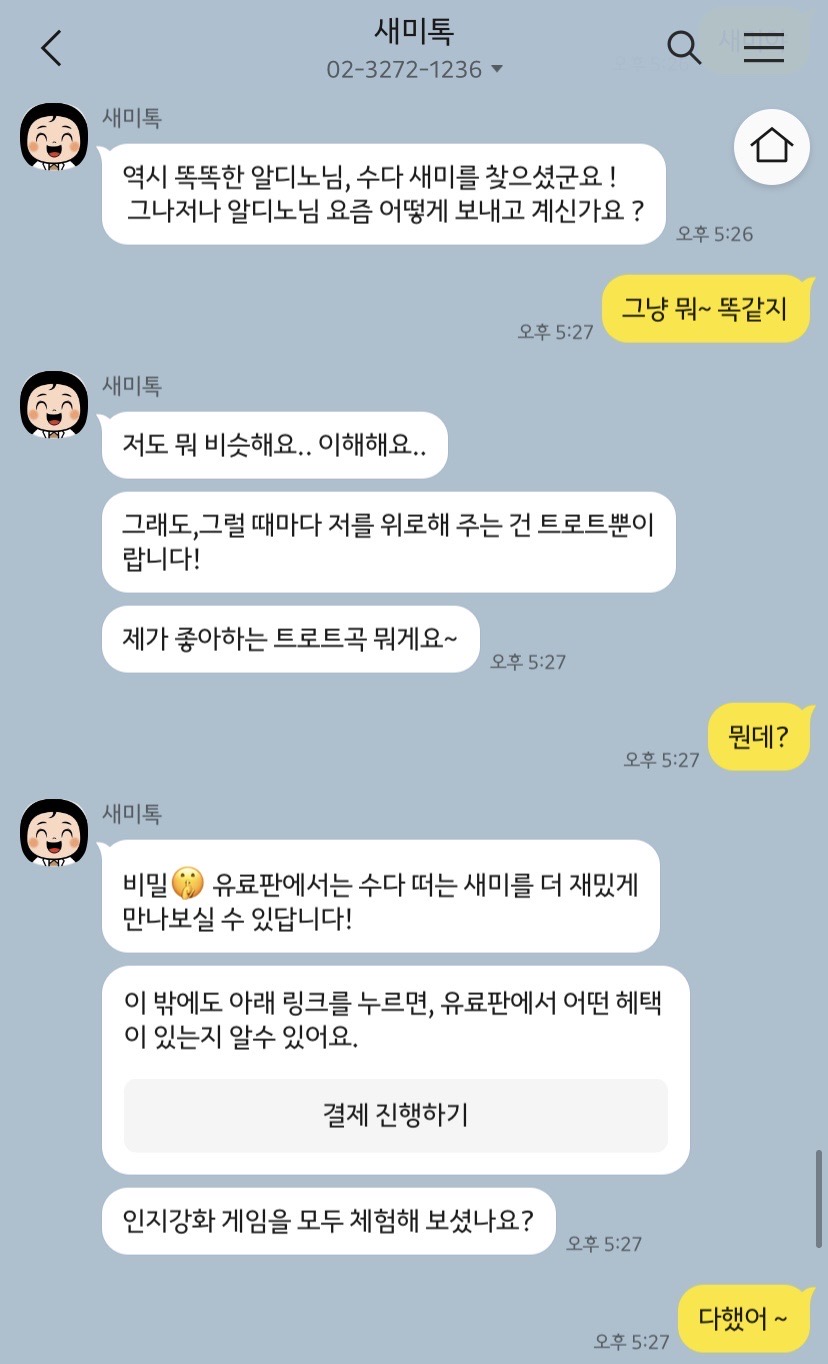 게임이 모두 끝나고 나면 새미와 짧은 대화를 주고받을 수 있었어요. 하지만 더 많은 수다와 게임을 체험하기 위해서는 유료판을 결제해야 한다는 점.!