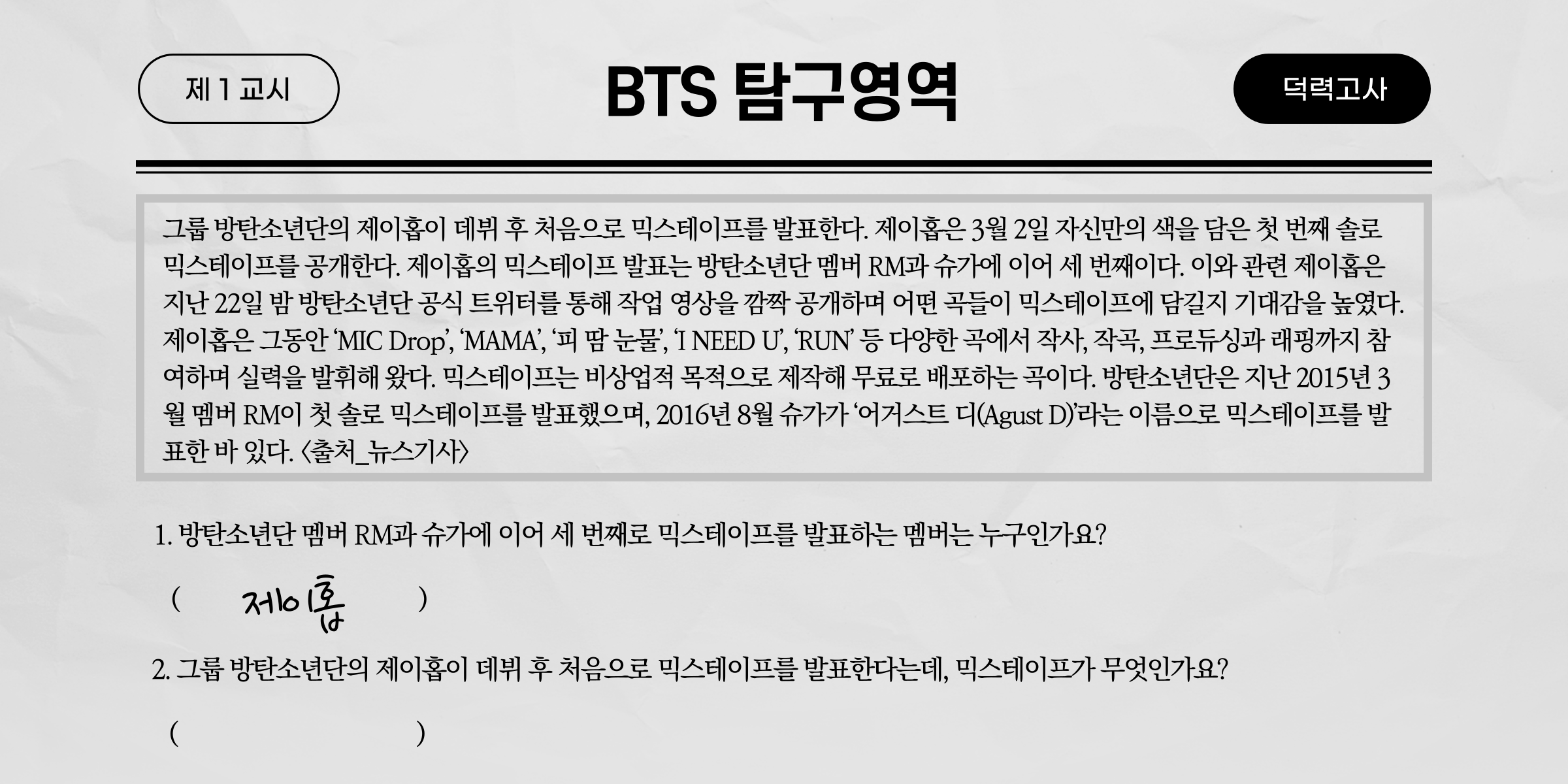 위 이미지를 보면 BTS 관련 뉴스기사 본문과, 문제가 나와 있다. 2개의 문제 모두 본문을 읽고 나면 충분히 답할 수 있는 문제다. 그렇다면 만약 인공지능한테 이 본문을 보여주고 문제를 풀라고 하면 과연 정답을 맞힐 수 있을까? 아마 인공지능이 정답을 맞히려면 먼저 질문의 의도를 파악해야 하며, 기사 문맥의 흐름을 이해해야 할 것이다. 하지만 어떻게 인공지능 스스로 문맥의 정보를 학습할 수 있을까?