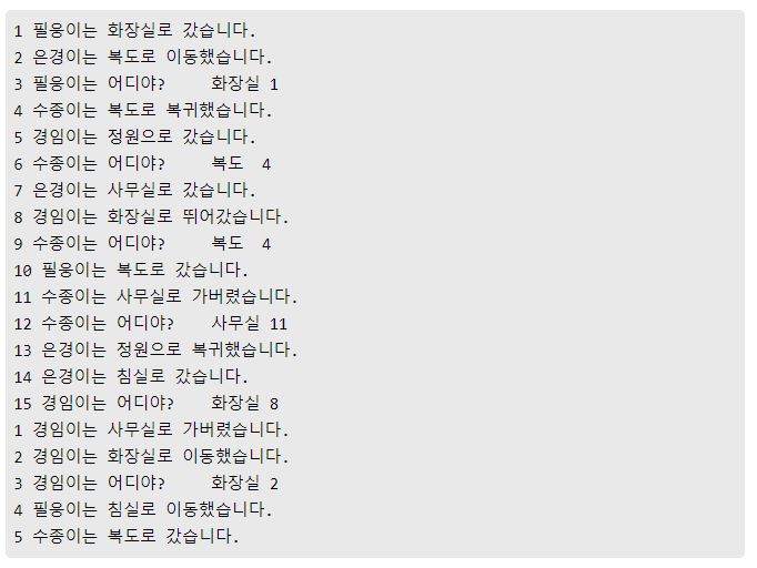 데이터셋을 보면 '필웅이는 화장실로 갔습니다', '은경이는 복도로 이동했습니다'라는 텍스트가 있는데 이를 보고, '필웅이는 어디야?'라는 질문에 '화장실'을 대답하도록 하는 모델을 만든다.