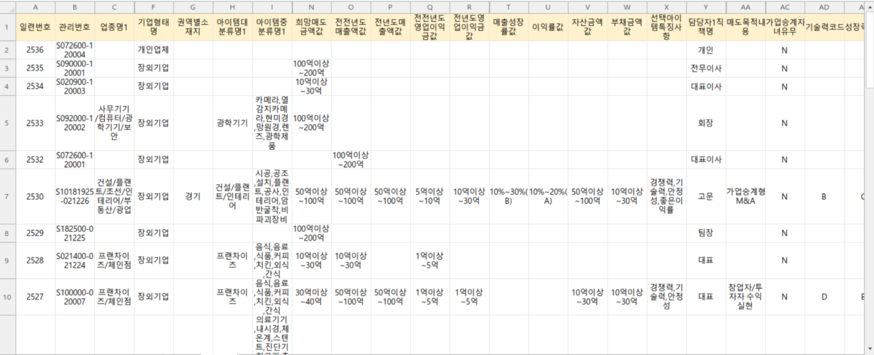 - 칼럼 : 관리번호, 인수주체 아이템 대/중/소 분류명, 인수주체 업종명, 형태명, 인수희망 업종명, 인수희망 아이템, 희망인수금액값, 희망매출액값 등