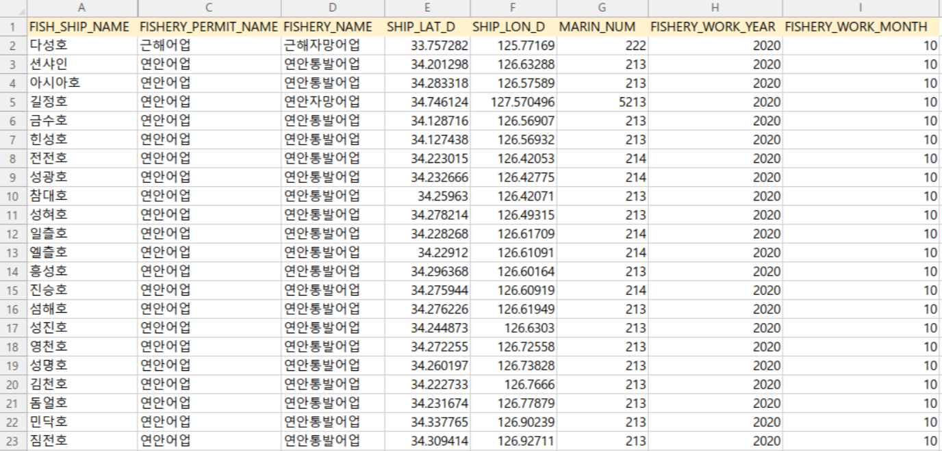 - 칼럼 : 어선명, 어업구역, 어업종류, 조업 위도, 조업 경도, marine번호, 조업 연도, 조업 월