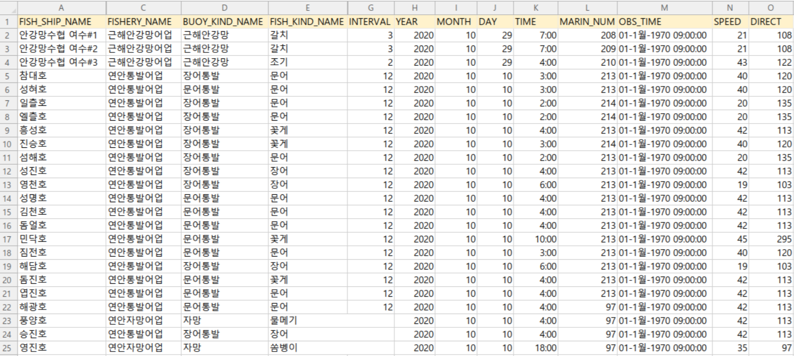 - 칼럼 : 어선명, 어업구역, 어업종류, 어획 품목명, 인터벌, 년, 월, 일, 시간, marine번호, OBS time, 속도, 방향 등