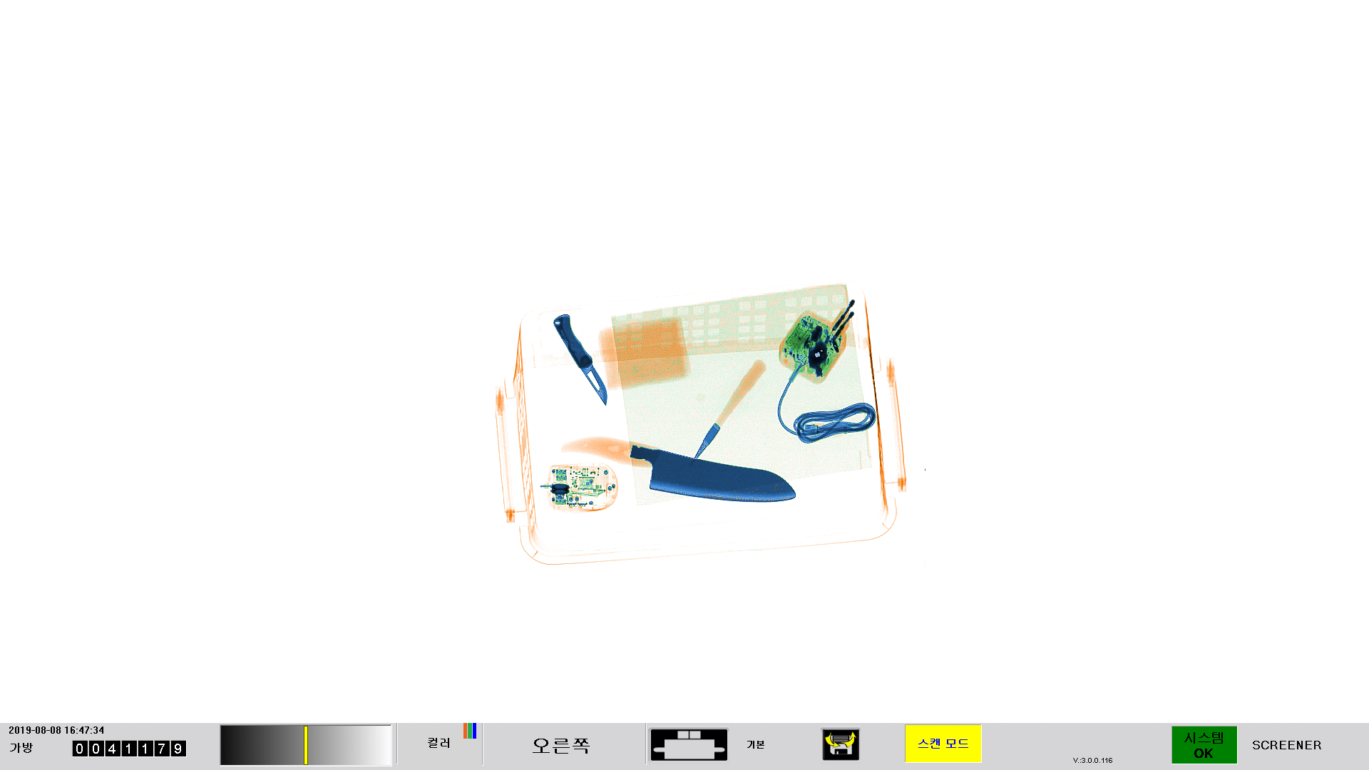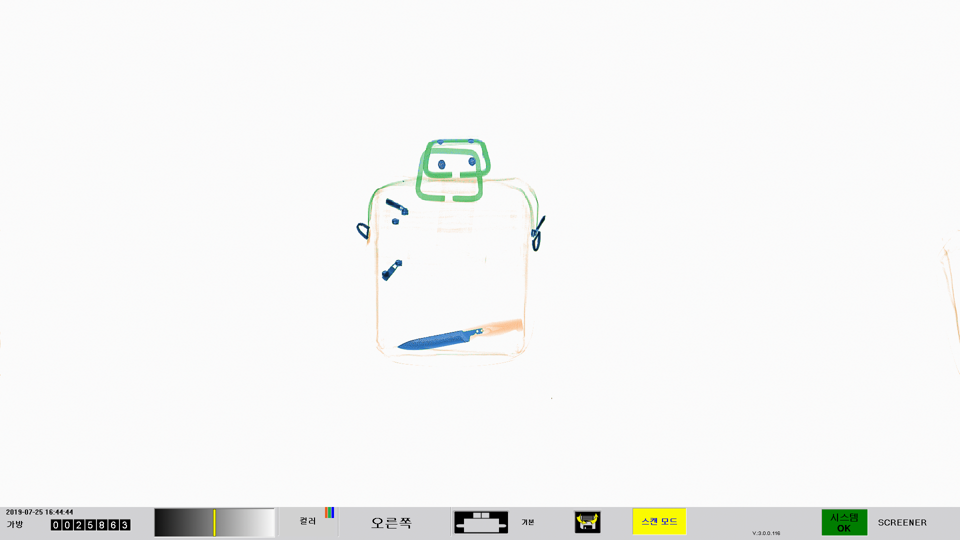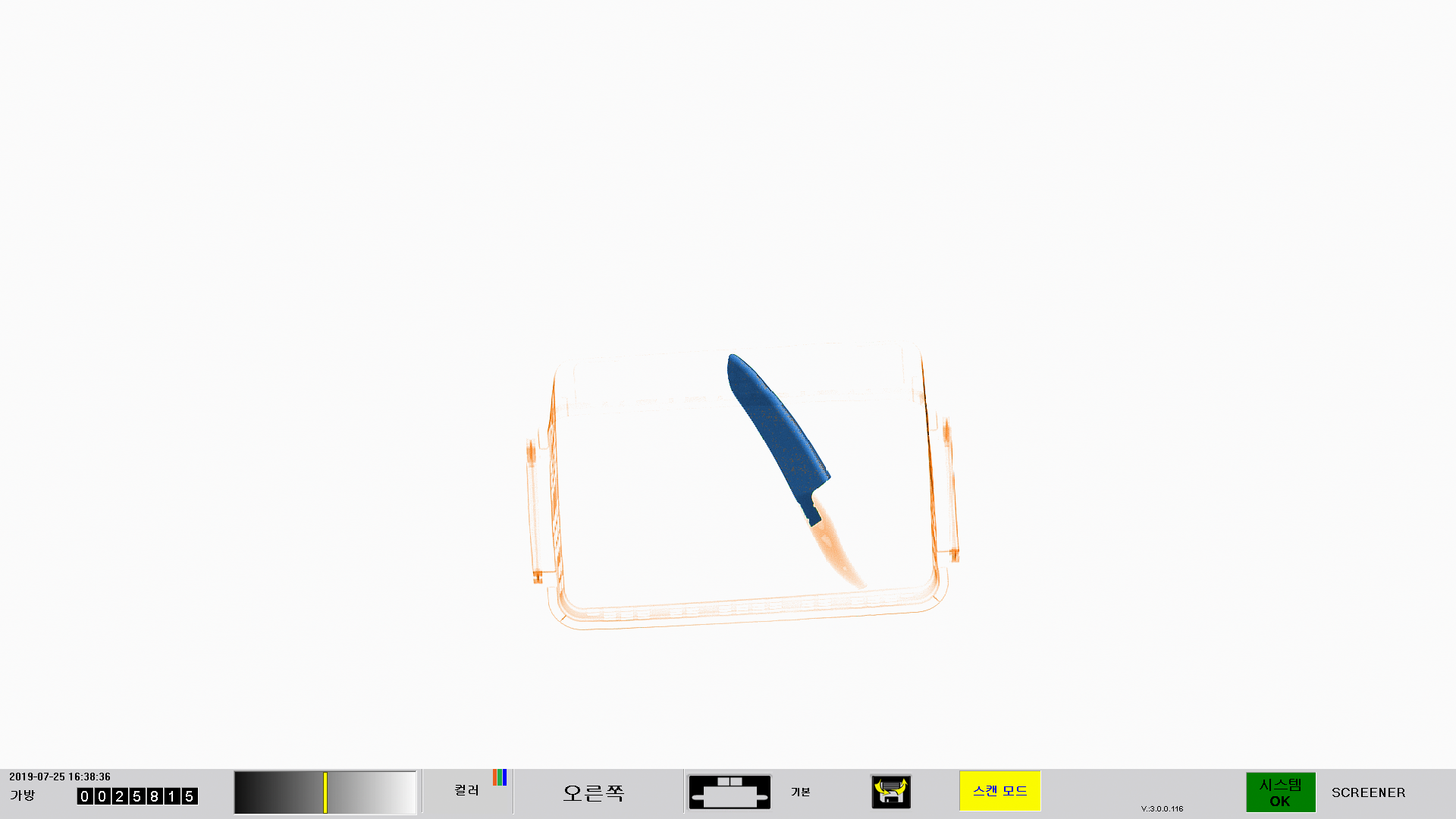 마지막으로 단일 비품목 이미지는 해당 품목의 샘플 1개와 다른 위해 물품 없이 일반 품목을 동시에 넣고 생성된 이미지로, 여러 물품 중 딱 1개의 위해물품인 칼이 있는 것을 위 이미지에서 확인할 수 있습니다.
