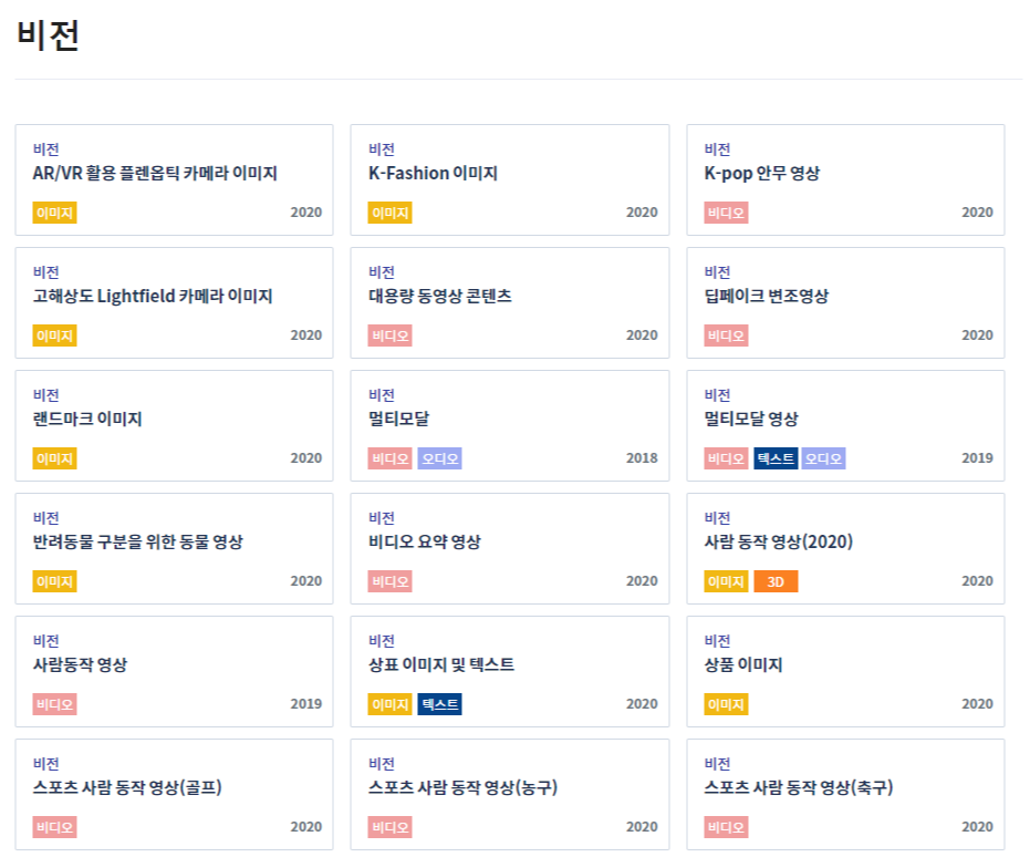 한편, 오늘 살펴본 데이터는 '비전' 카테고리에 있는 데이터였는데요, 비전 카테고리는 말 그대로 시각적인 요소가 포함되어 있는 이미지, 비디오 데이터 등을 제공하는 카테고리입니다. 특히 다른 빅데이터 플랫폼에서는 찾아보기 힘든 데이터들이 제공되고 있고, 한국어, 한국인, 한국건물, 한국음식 등 서양보다는 우리나라에 맞춰져 있는 데이터들이 있기 때문에 상당히 활용하기에 적합한 데이터이기도 합니다.