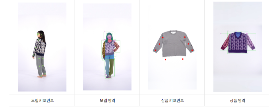 마지막으로 모델 키포인트, 모델영역, 상품 키포인트, 상품영역의 데이터는 다음과 같습니다.