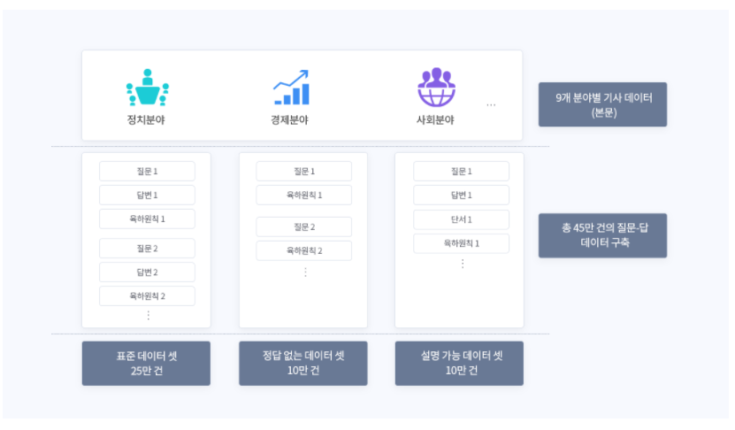 '기계독해' 데이터는 기계독해 개발에 활용될 수 있는 뉴스 본문 기반 학습 데이터셋 45만 건을 구축한 데이터로, 뉴스 본문과 질문, 답으로 구성되어 있는데요, 질문과 답으로만 구성되어 있는 표준 데이터셋(25만 건), 본문에서 답을 찾을 수 없는 질문이 포함된 정답 없는 데이터셋(10만 건), 질문과 답과 그 답을 선택한 단서가 포함된 설명 가능 데이터셋(10만 건)이 있습니다.