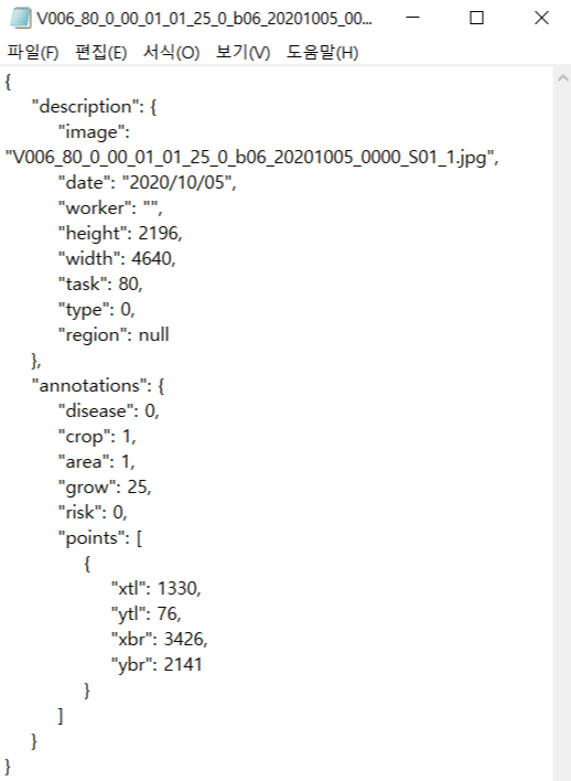 위 json 데이터를 잘 살펴보면 이미지 데이터로만 알 수 없는 정보들이 있는데요, 크게 이미지 정보(촬영 일자, 촬영 지역, 이미지 사이즈, 질병 유형), 학습용 정보(질병/해충 코드, 작물 코드, 촬영 부위, 작물 생육단계, 질병 피해 정도, 주목 객체의 bbox 좌표)를 알 수 있답니다.
