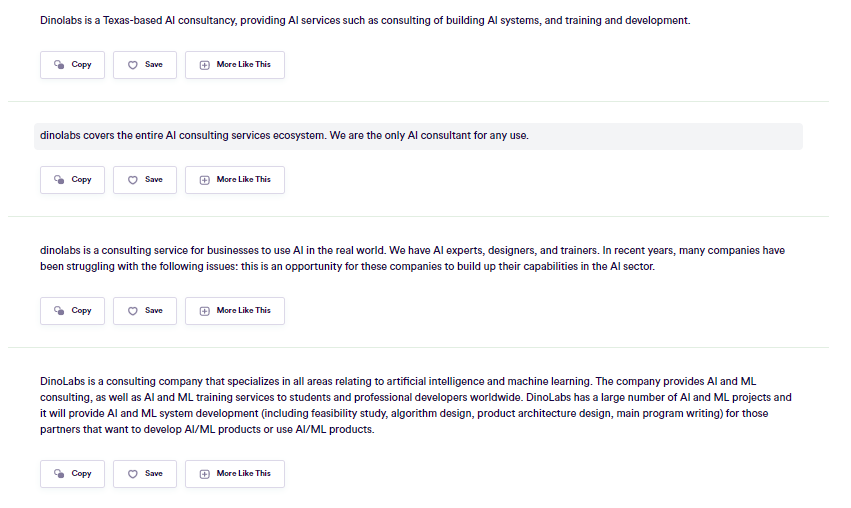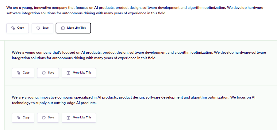 "More Like This" 버튼을 누르면 생성된 문구에 대해서 더 다양한 표현으로 여러가지 버전을 만들어 줍니다.
