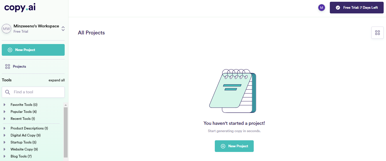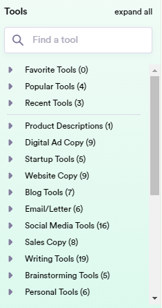 왼쪽 창의 "Tools"를 통해 여러가지 다양한 스타일의 광고문구도 생성할 수 있습니다!