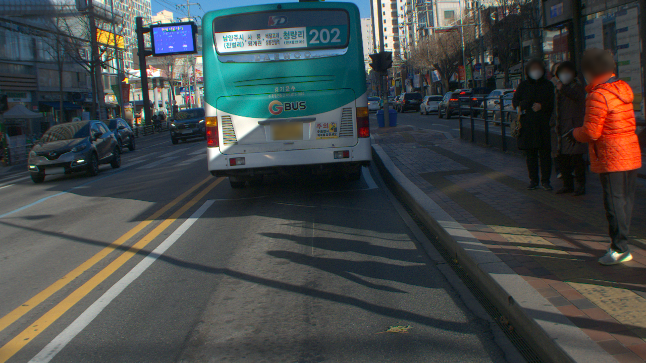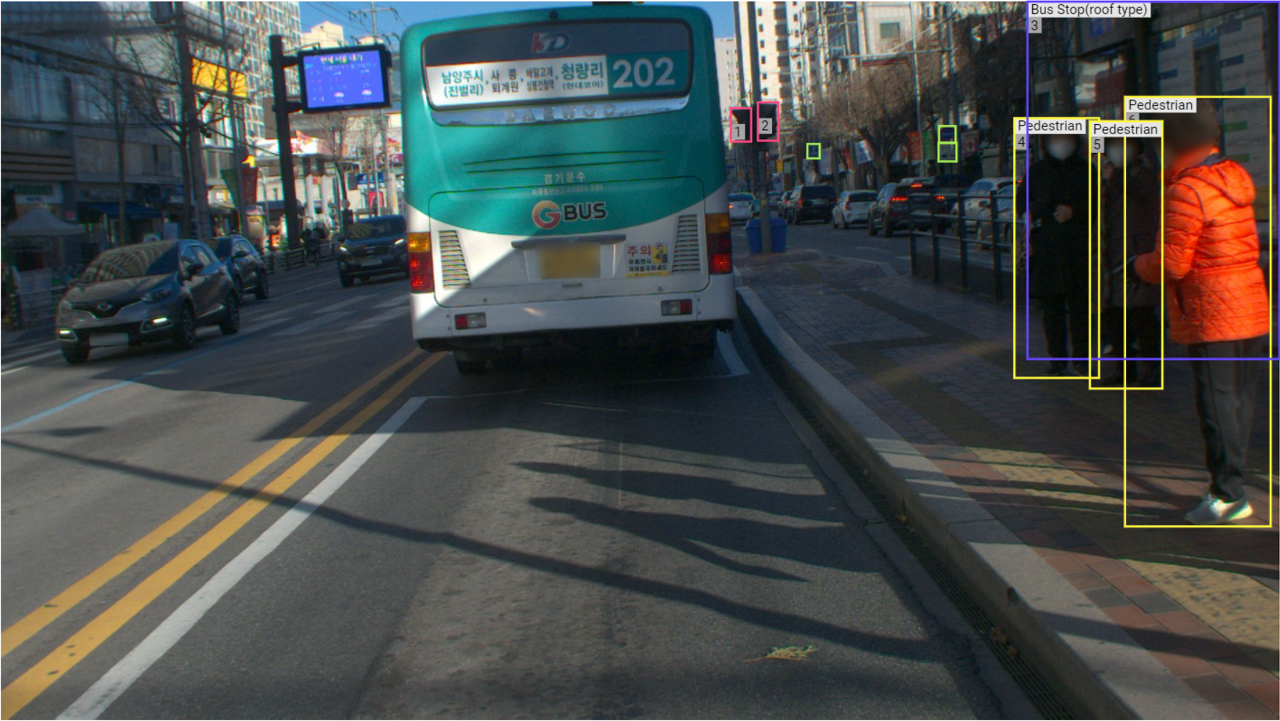 원천 데이터에는 위와 같이 버스 정류장, 신호등, 도로, 버스전용차로, 전용차로 외 주행가능 영역 등 다양한 환경에서 촬영한 버스 노선 주행 영상 데이터입니다. 이미지를 보면 버스정류장, 도로, 사람, 표지판 등의 객체가 있는 것을 확인할 수 있습니다.