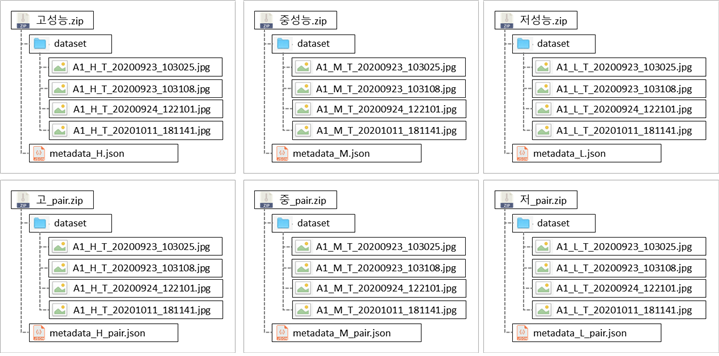 데이터를 다운로드하면, 위와 같이 고/중/저성능 데이터, 고/중/저-pair 데이터와 각각의 json 데이터로 이루어져 있습니다. 고/중/저성능 데이터는 각 성능의 열화상 카메라로 촬영된 데이터이고, pair 데이터는 고성능 카메라 기준으로 중성능/저성능 카메라로 촬영한 데이터의 온도 보정을 한 데이터입니다. 그럼 각 데이터에 대해 살펴볼까요~?