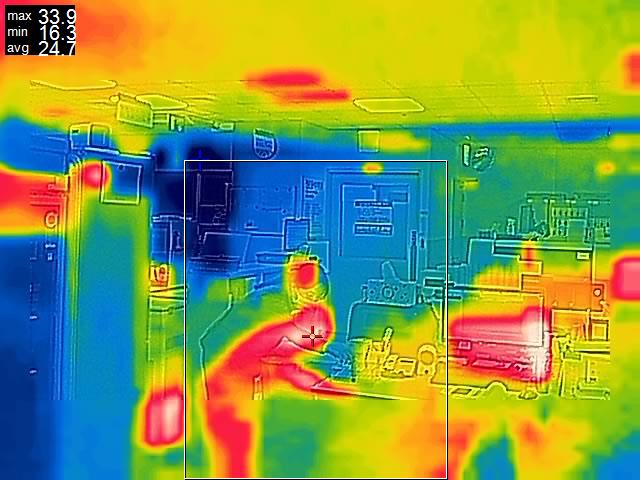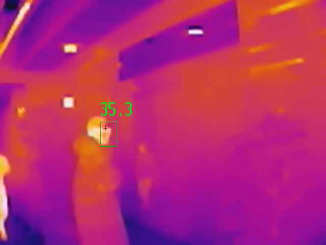 마지막으로는 저성능 열화상 카메라로 촬영한 이미지(위)와 고성능 데이터 기준으로 온도 보정이 이루어진 이미지(아래)입니다. 위 이미지를 살펴보면 저성능 카메라의 해상도가 많이 낮아 옷과 사람의 피부를 구별하기 쉽지 않음을 알 수 있습니다.