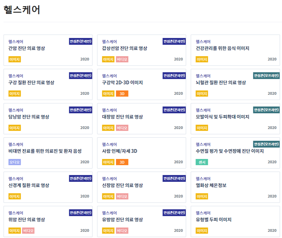 한편, 오늘 살펴본 데이터는 '헬스케어' 카테고리에 있는 데이터였는데요, 헬스케어 카테고리는 질환 및 질병 진단 의료 영상, 인체 자세, 신체 정보 등에 관련된 데이터를 제공하는 카테고리입니다. 특히 개인이 구축하기엔 어려운 의료 데이터들이 많고, 다른 빅데이터 플랫폼에서는 찾아보기 힘든 데이터들이 제공되고 있습니다. 또한 실제 우리나라 사람들로부터 구축된 데이터들로 이루어져 있기 때문에 우리나라에서 상용화하기 위한 서비스 개발에 활용하기에 매우 적합한 데이터이기도 하답니다.