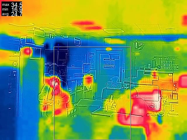 반면 위 이미지는 중성능 열화상 카메라로 촬영된 이미지(위)와 고성능 데이터 기준으로 온도 보정이 된 이미지(아래) 데이터입니다.